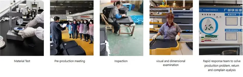 Teljes mértékben megfelelünk az ISO9001 szabványnak az autószőnyegek tervezése és gyártása tekintetében, az ISO/TSI16949 a minőség-ellenőrzés, az ISO14001:2015 a környezetmenedzsment, a BSCI a társadalmi felelősségvállalás és az EU REACH szabványok a nyersanyagok tekintetében. Házon belüli tesztelési létesítményekkel rendelkezünk az önellenőrzések elvégzésére, hogy megbizonyosodjunk arról, hogy termékeink megfelelnek az SGS, az Intertek vagy bármely más, az ügyfelek által kért külső ellenőr által elvégzett tesztnek.