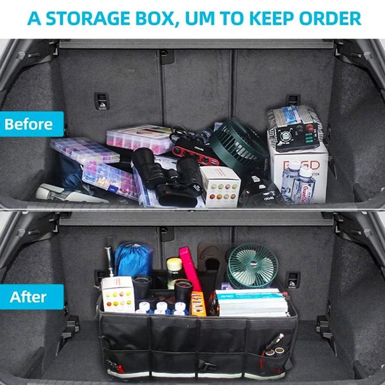 Három fő rekeszben találhatók a szerszámok, élelmiszerek, sportfelszerelések, tisztítószerek és sürgősségi cikkek. Négy hálós oldalzseb apró dolgok, például törölközők vagy kártyák tárolására. Az elülső fedeles zseb biztosítja az esélyeket és a végeket. Illik teherautókhoz, szedánokhoz, terepjárókhoz, kisteherautókhoz és szinte bármilyen járműhöz.