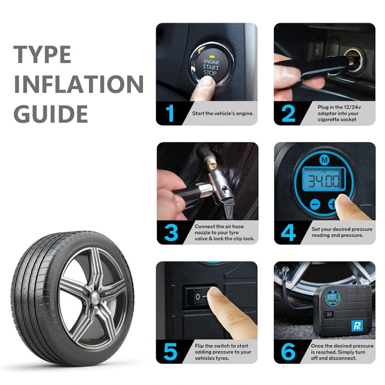 Ez a digitális gumiabroncs-szivattyú a beállított nyomáson automatikusan kikapcsol. Csatlakoztassa a 12 V-os csatlakozót, csatlakoztassa a fúvókát, állítsa be a PSI-t, nyomja meg a Start gombot. Egyszerű, gyors és készen áll, amikor szüksége van rá.