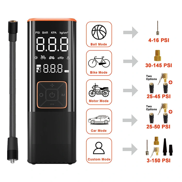 Nyomásegységek: PSI, KPA, BAR, KG/CM² és négy előre beállított felfújási mód. A négy előre beállított üzemmód nyomását járművének megfelelően állíthatja be. Ez a légszivattyú alkalmas:
